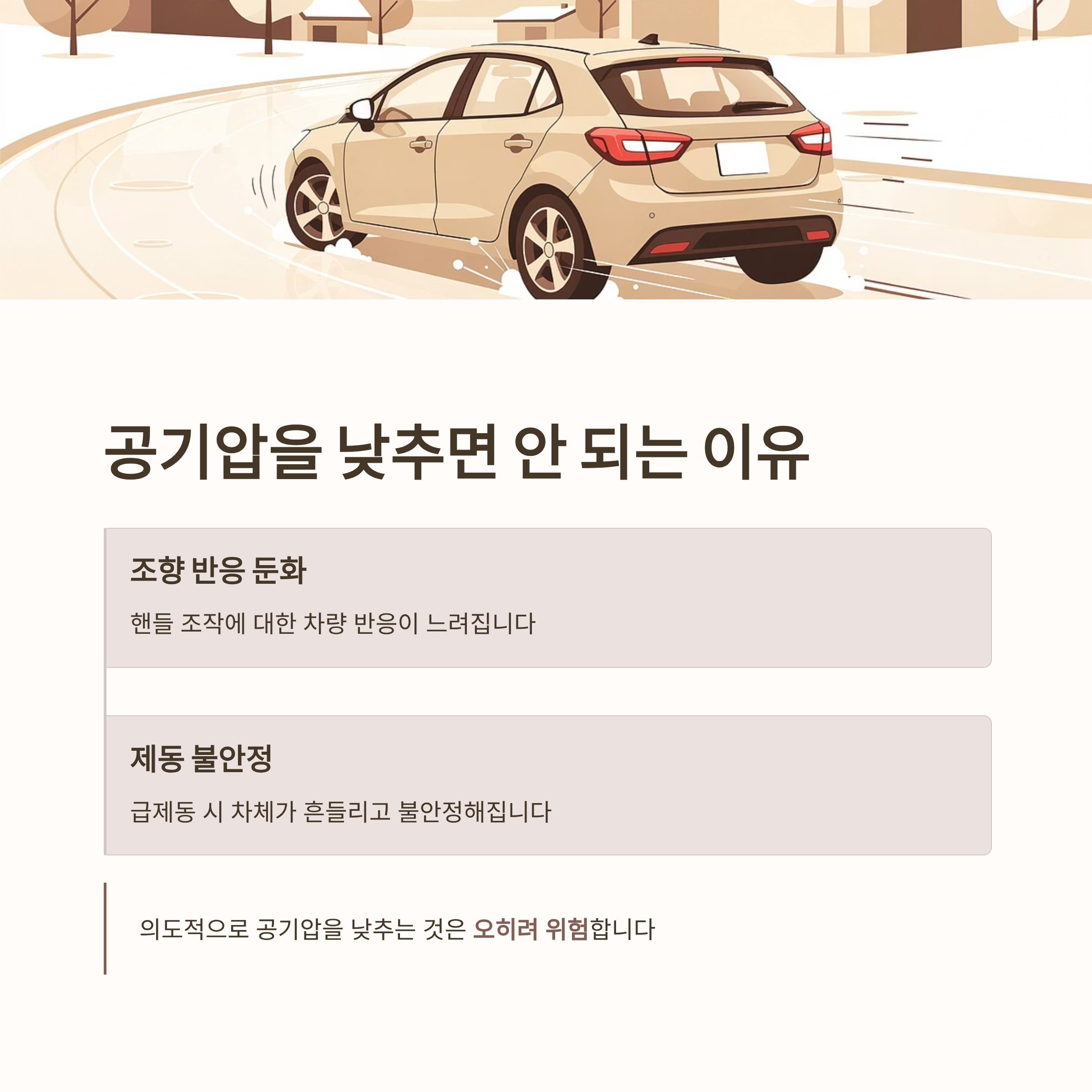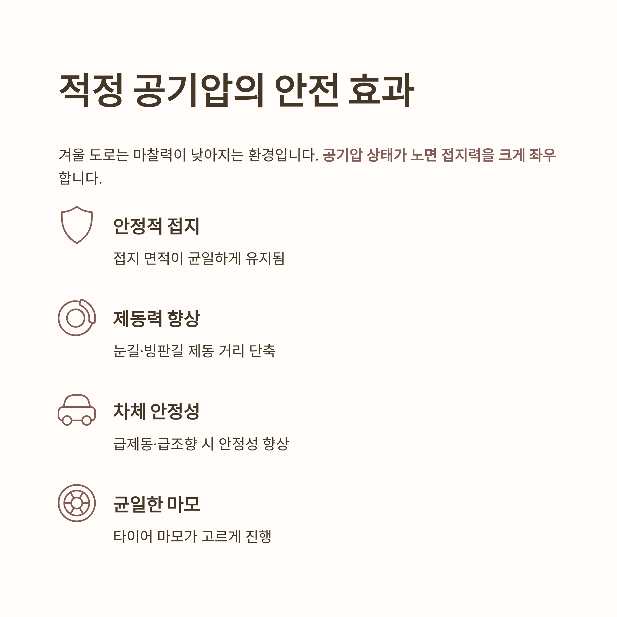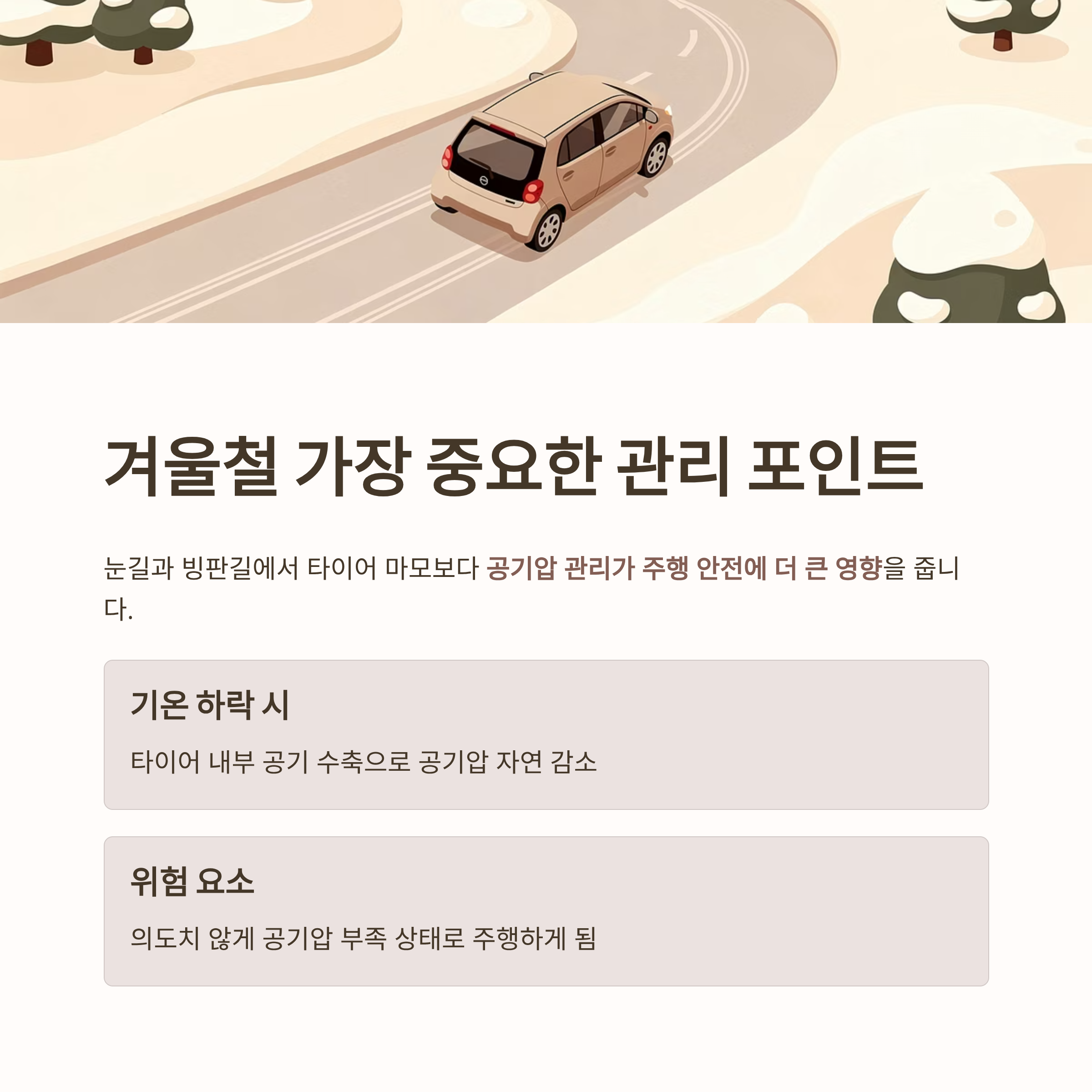 눈길과 빙판길이 반복되는 계절에는 타이어 마모 상태보다도 공기압 관리가 주행 안전에 더 큰 영향을 주는 경우가 많습니다.
