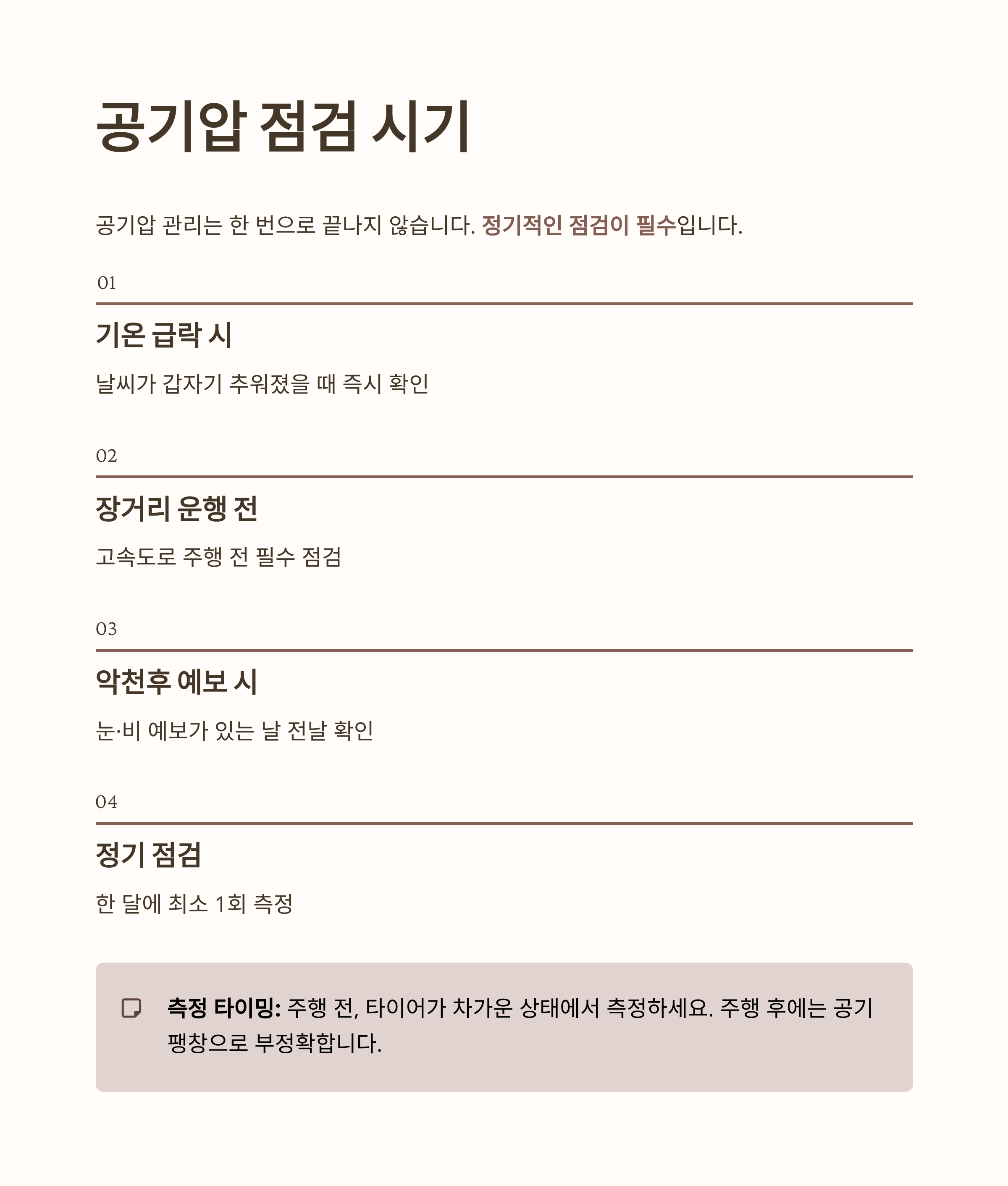 - 주행 전, 타이어가 차가운 상태에서 측정