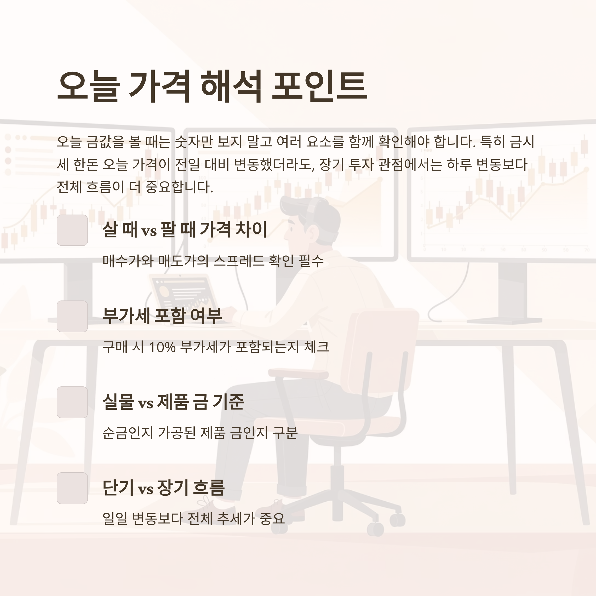 오늘 금값을 볼 때는 숫자만 보지 말고 아래 포인트를 함께 확인하시는 것이 좋습니다.