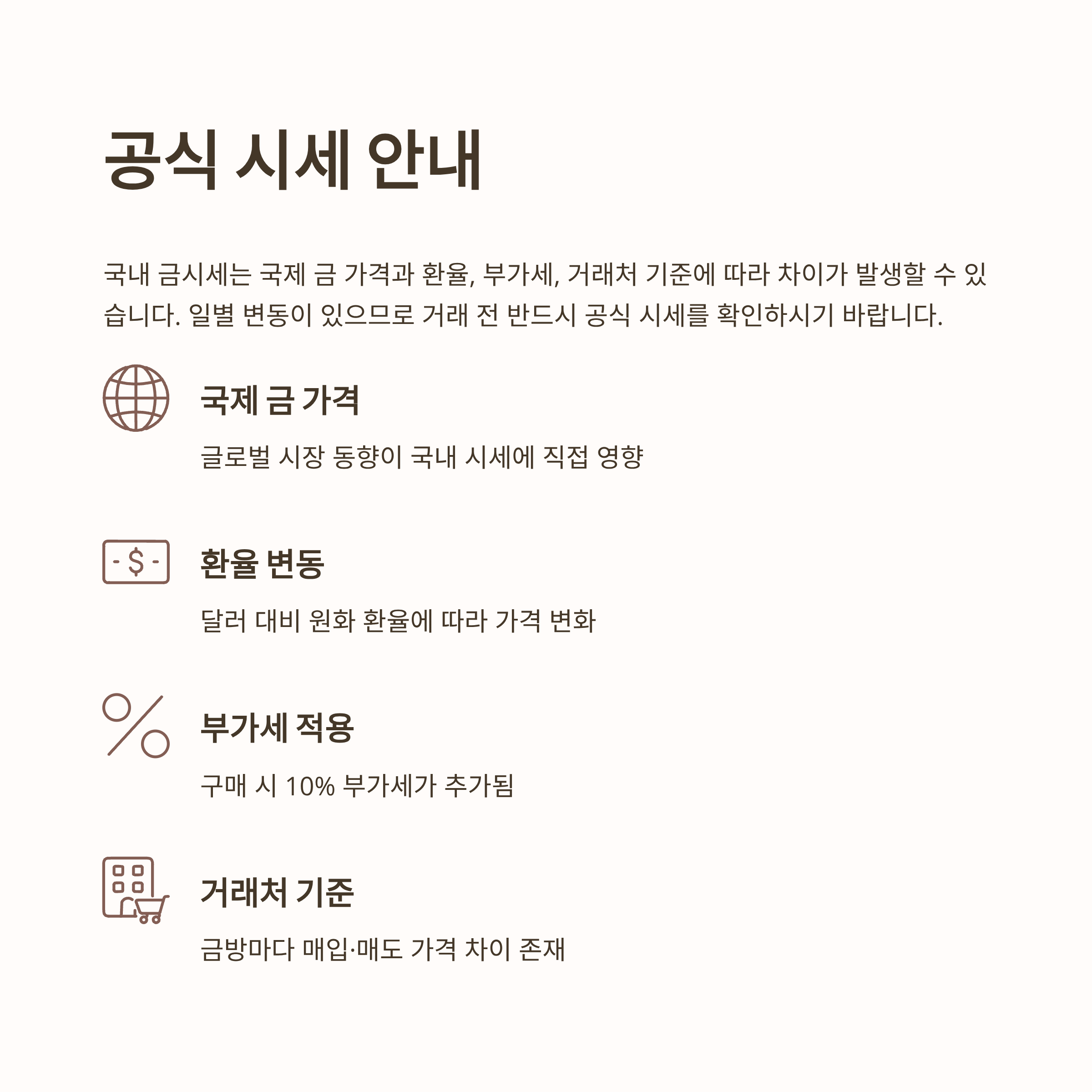 국내 금시세는 국제 금 가격과 환율, 부가세, 거래처 기준에 따라 차이가 발생할 수 있으며,