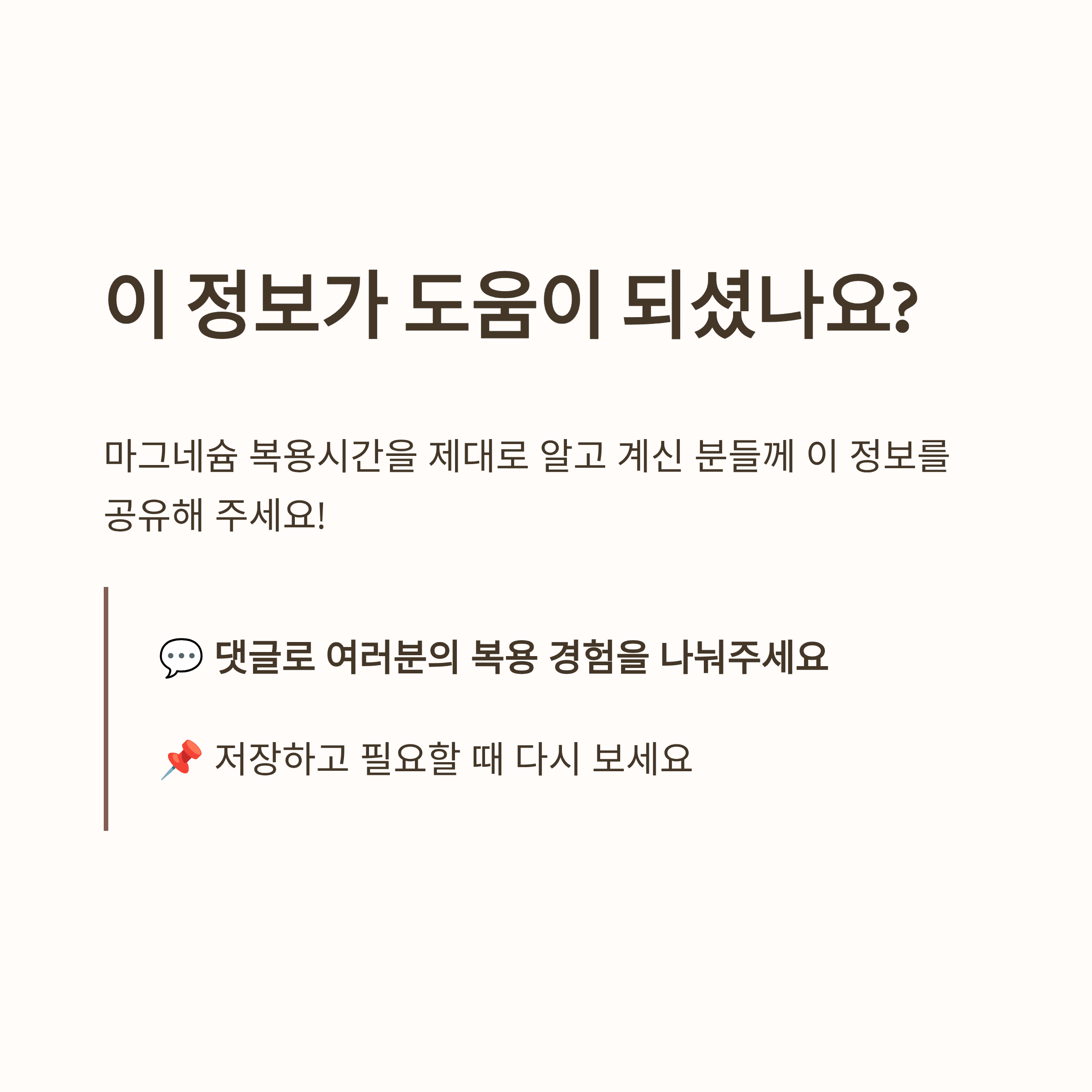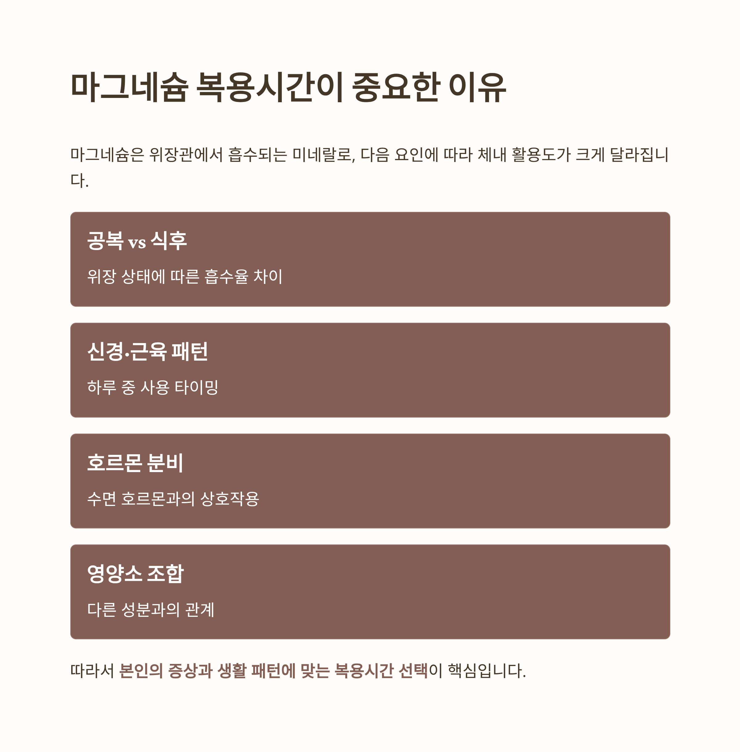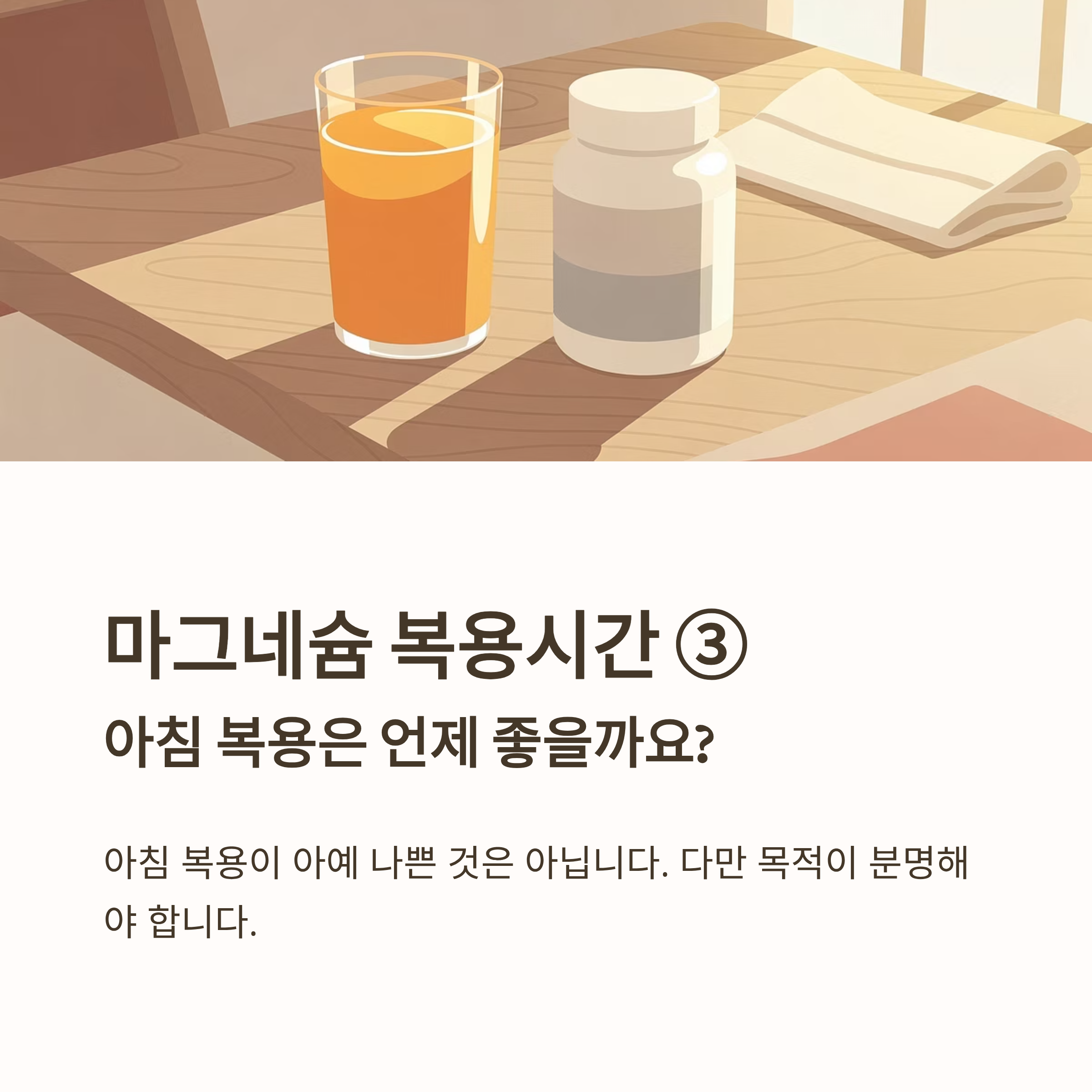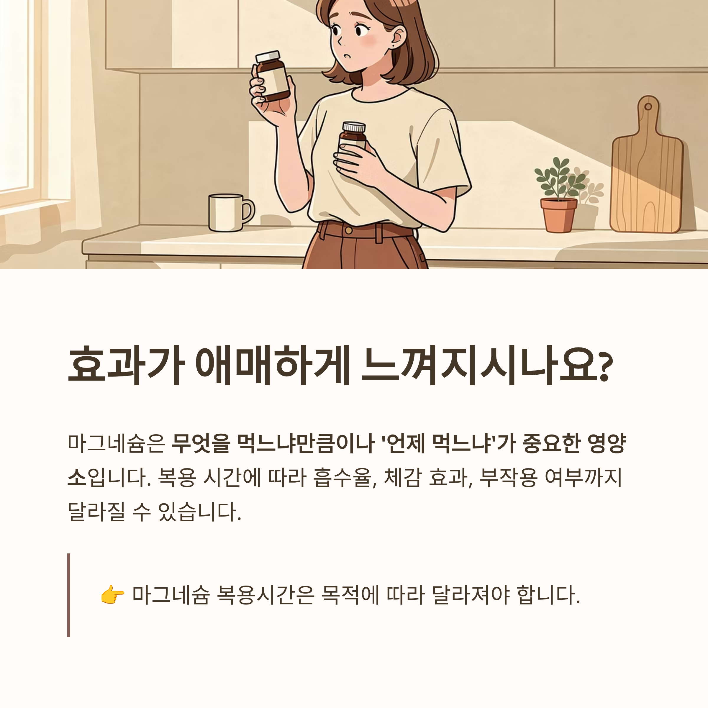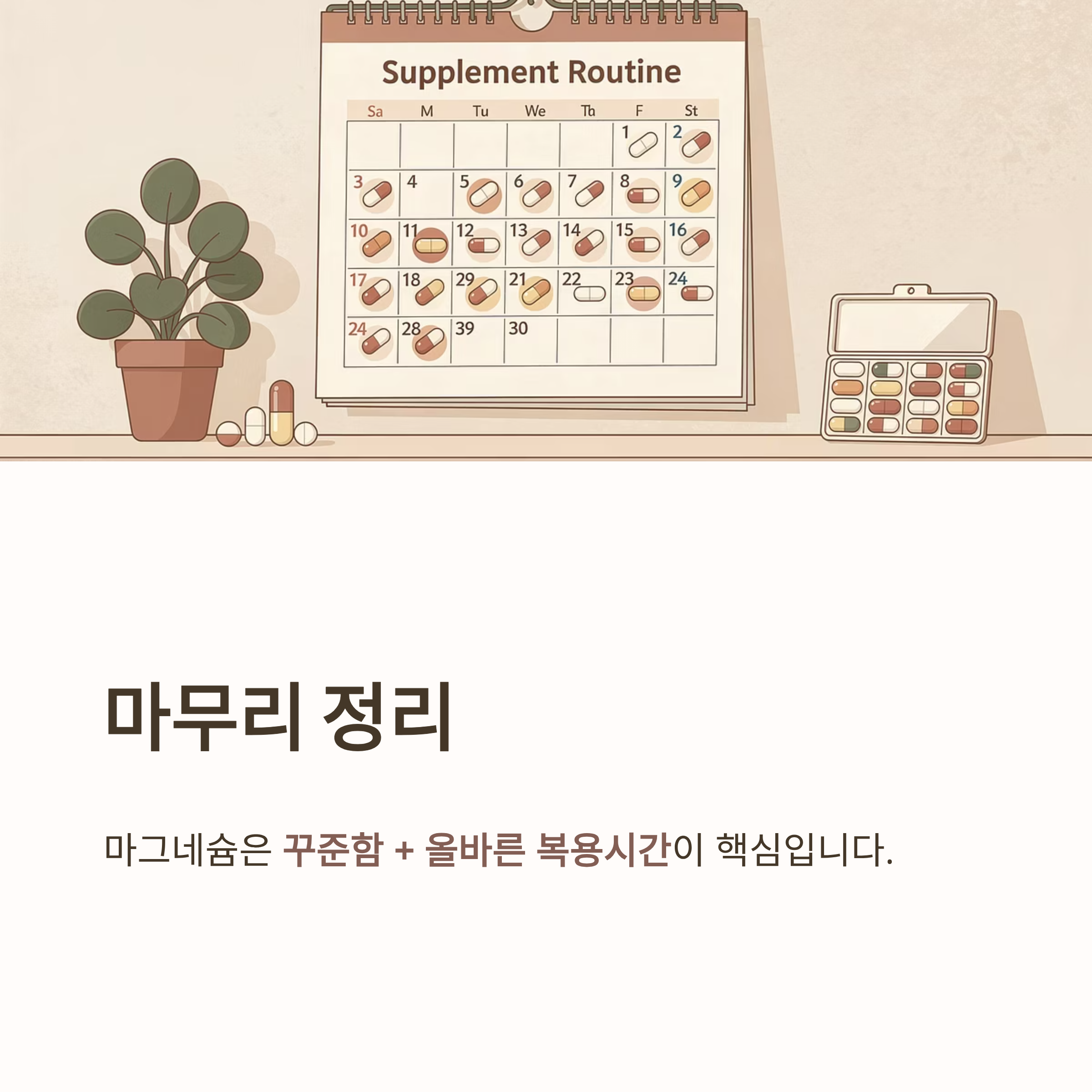 마그네슘은 꾸준함 + 올바른 복용시간이 핵심입니다.
