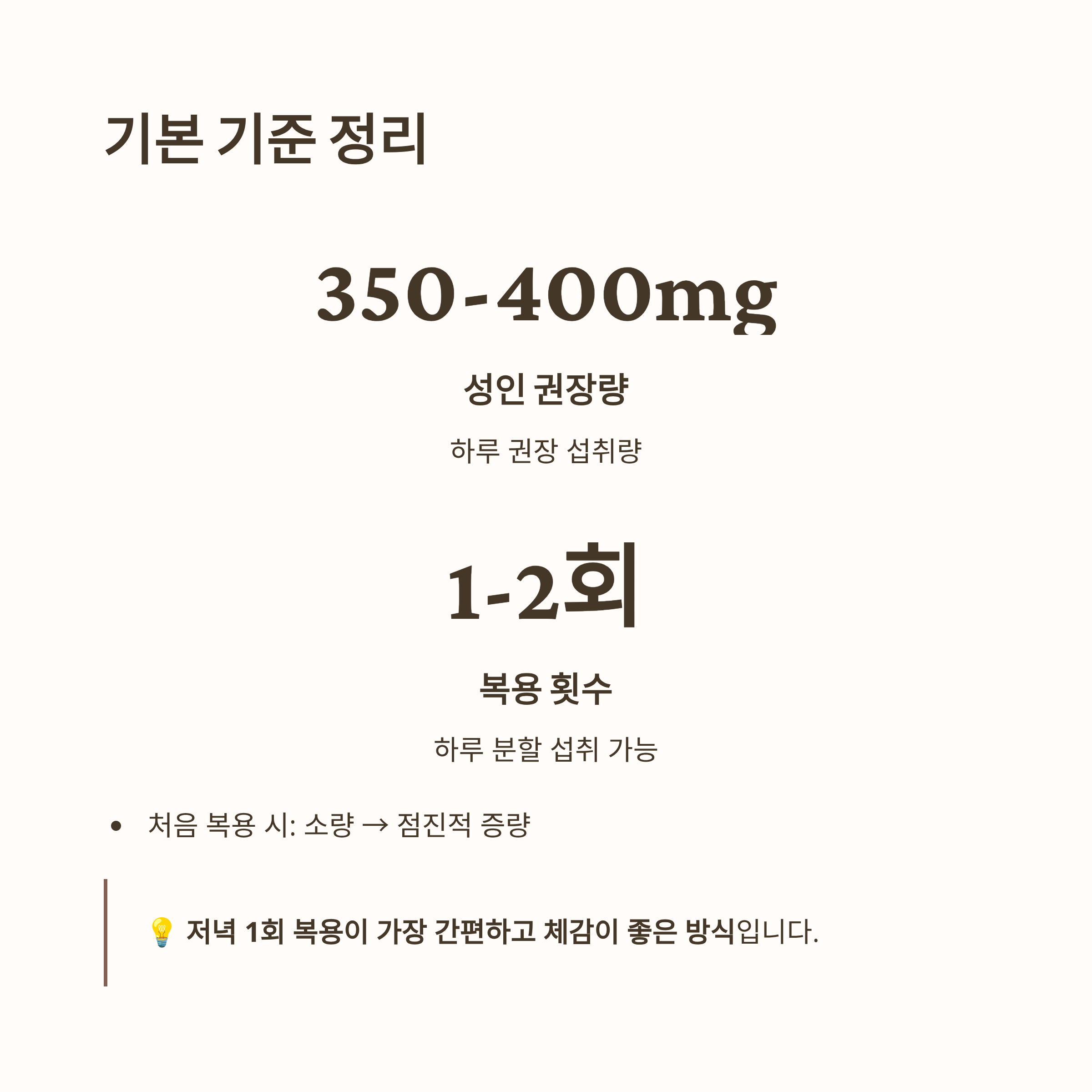 - 성인 권장 섭취량: 약 350~400mg