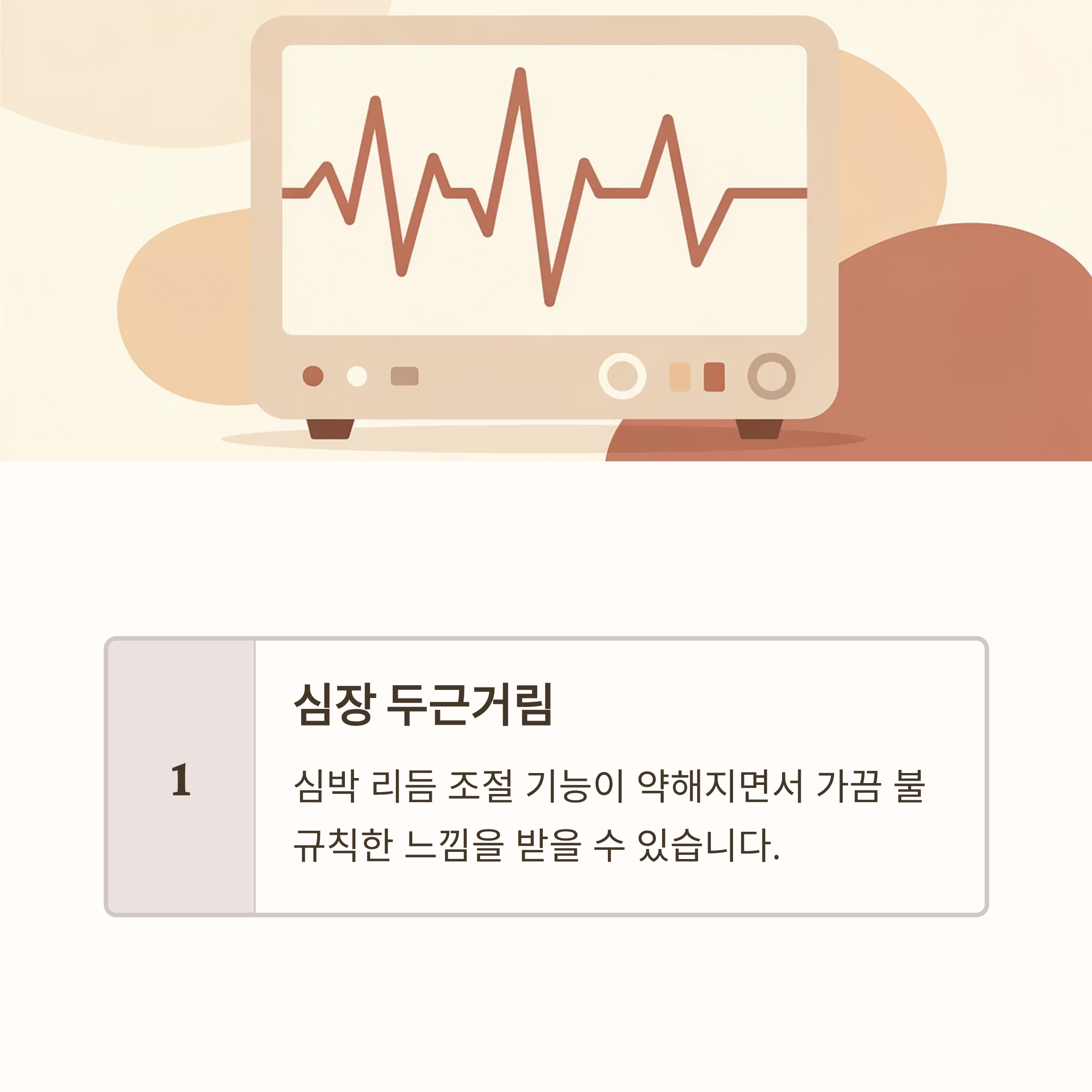 심박 리듬 조절 기능이 약해지면서 가끔 불규칙한 느낌을 받을 수 있습니다.