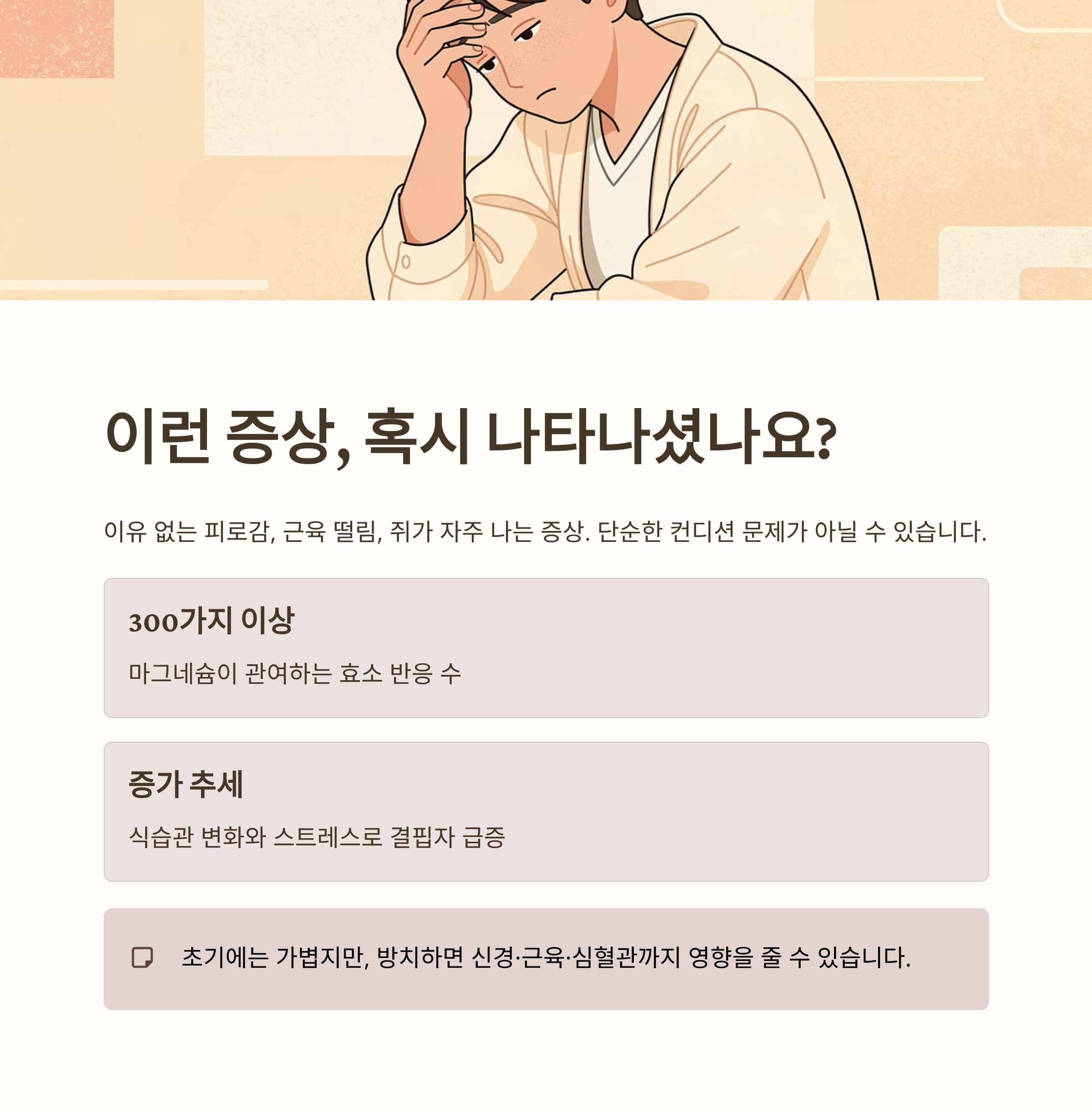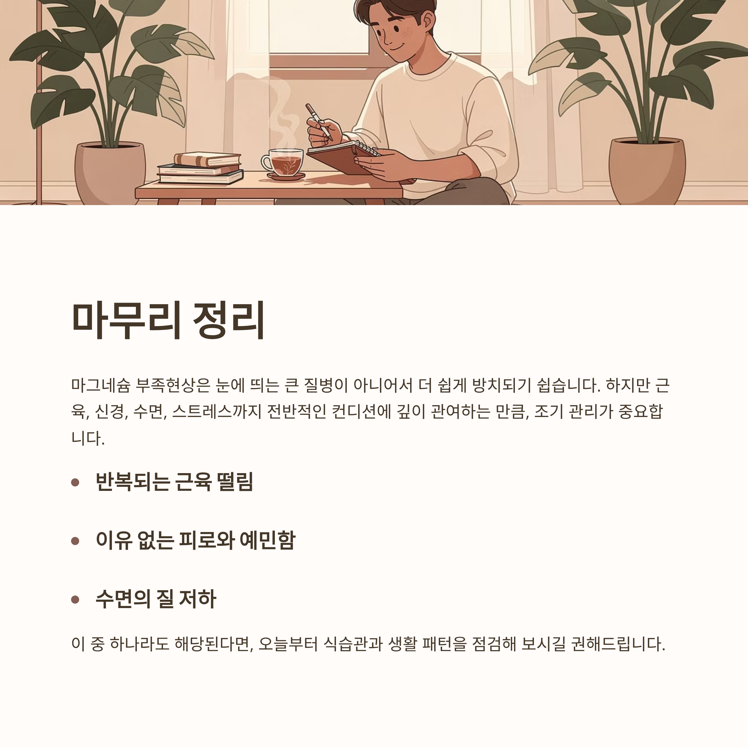 하지만 근육, 신경, 수면, 스트레스까지 전반적인 컨디션에 깊이 관여하는 만큼, 조기 관리가 중요합니다.