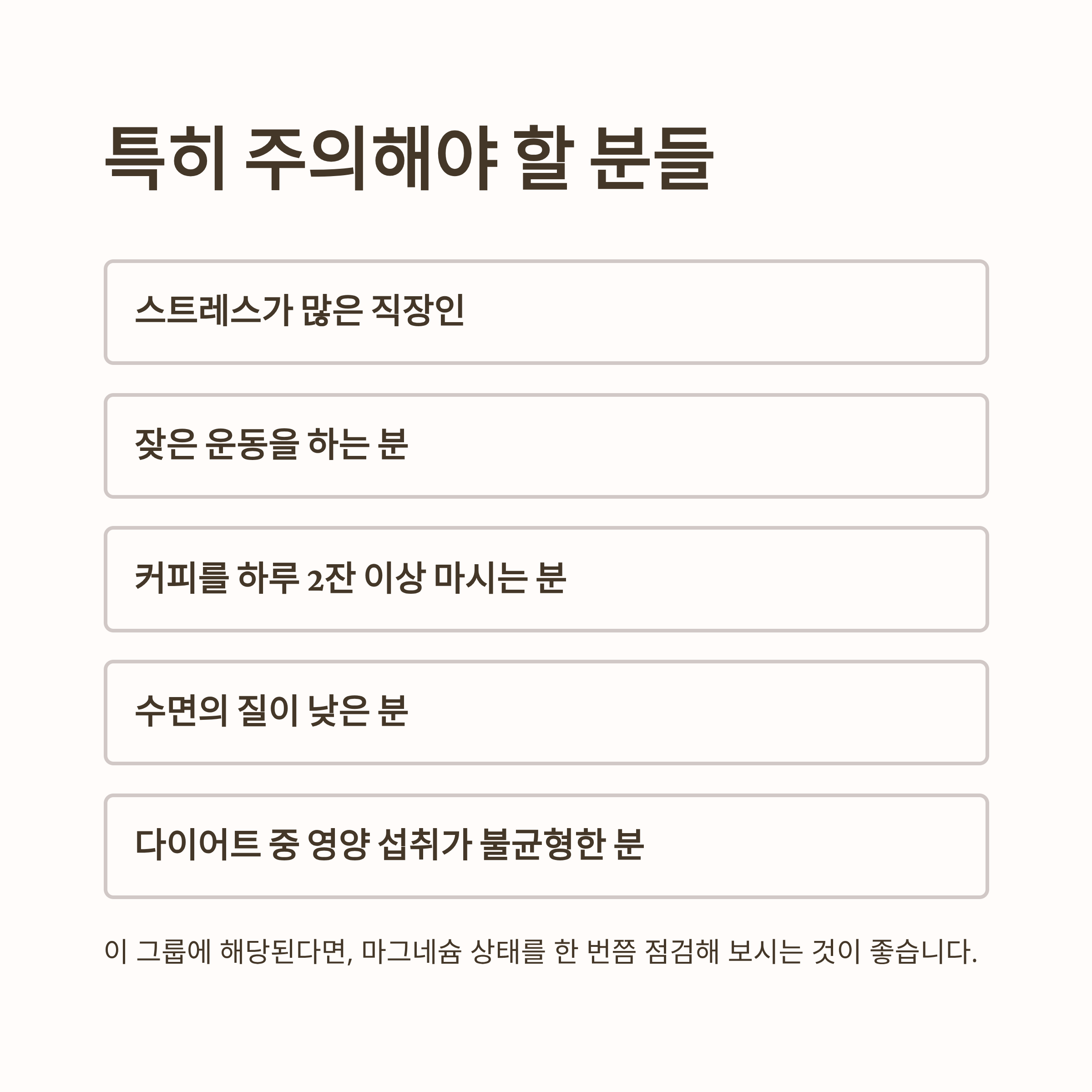 이 그룹에 해당된다면, 마그네슘 상태를 한 번쯤 점검해 보시는 것이 좋습니다.