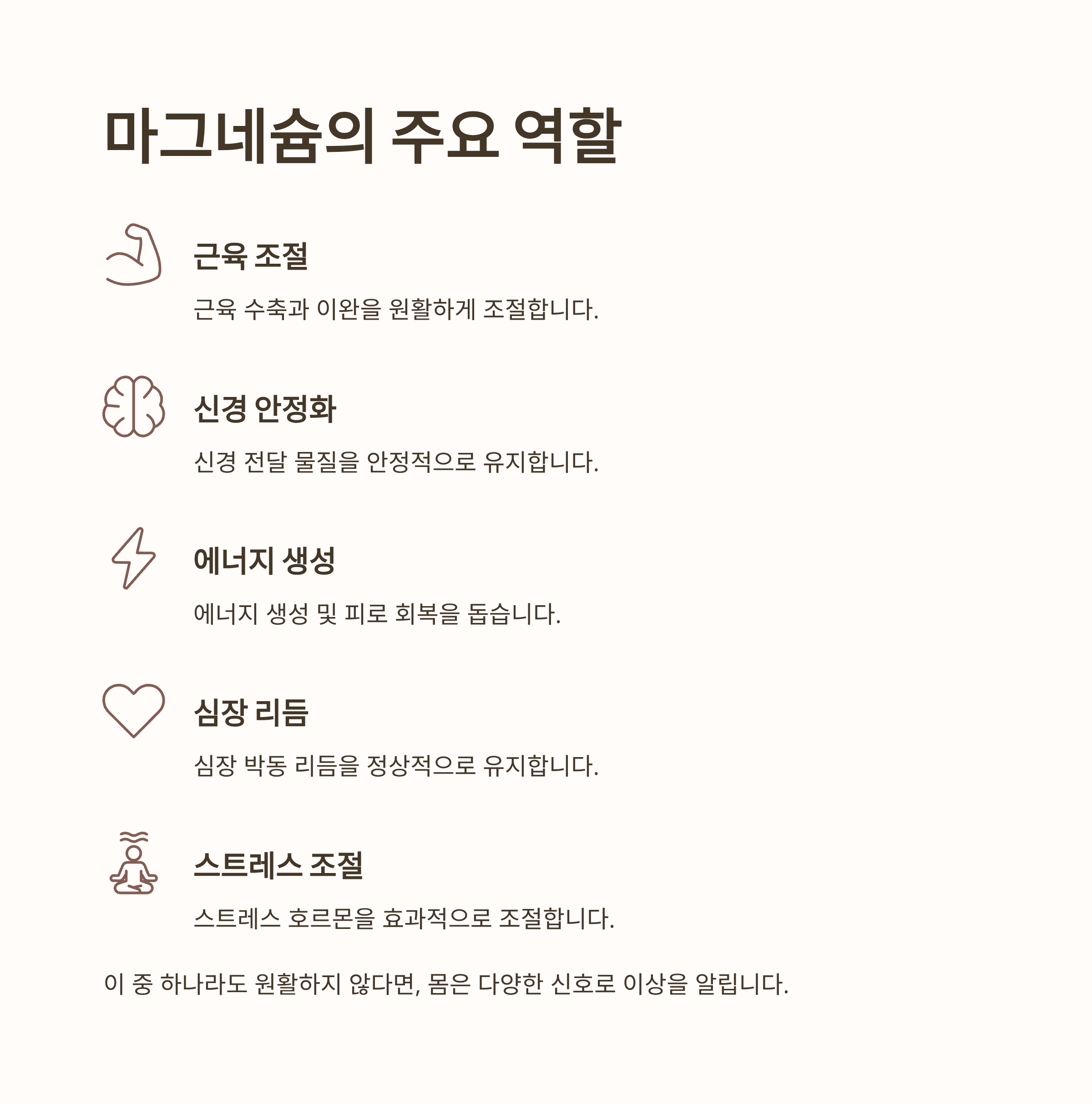 👉 마그네슘 부족은 초기에는 가볍지만, 방치하면 신경·근육·심혈관까지 영향을 줄 수 있습니다.
