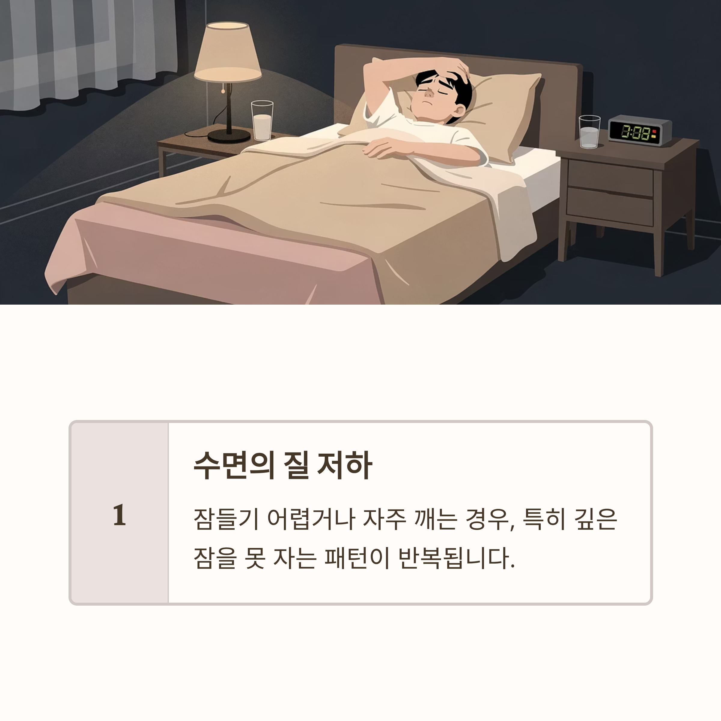 잠들기 어렵거나 자주 깨는 경우, 특히 깊은 잠을 못 자는 패턴이 반복됩니다.