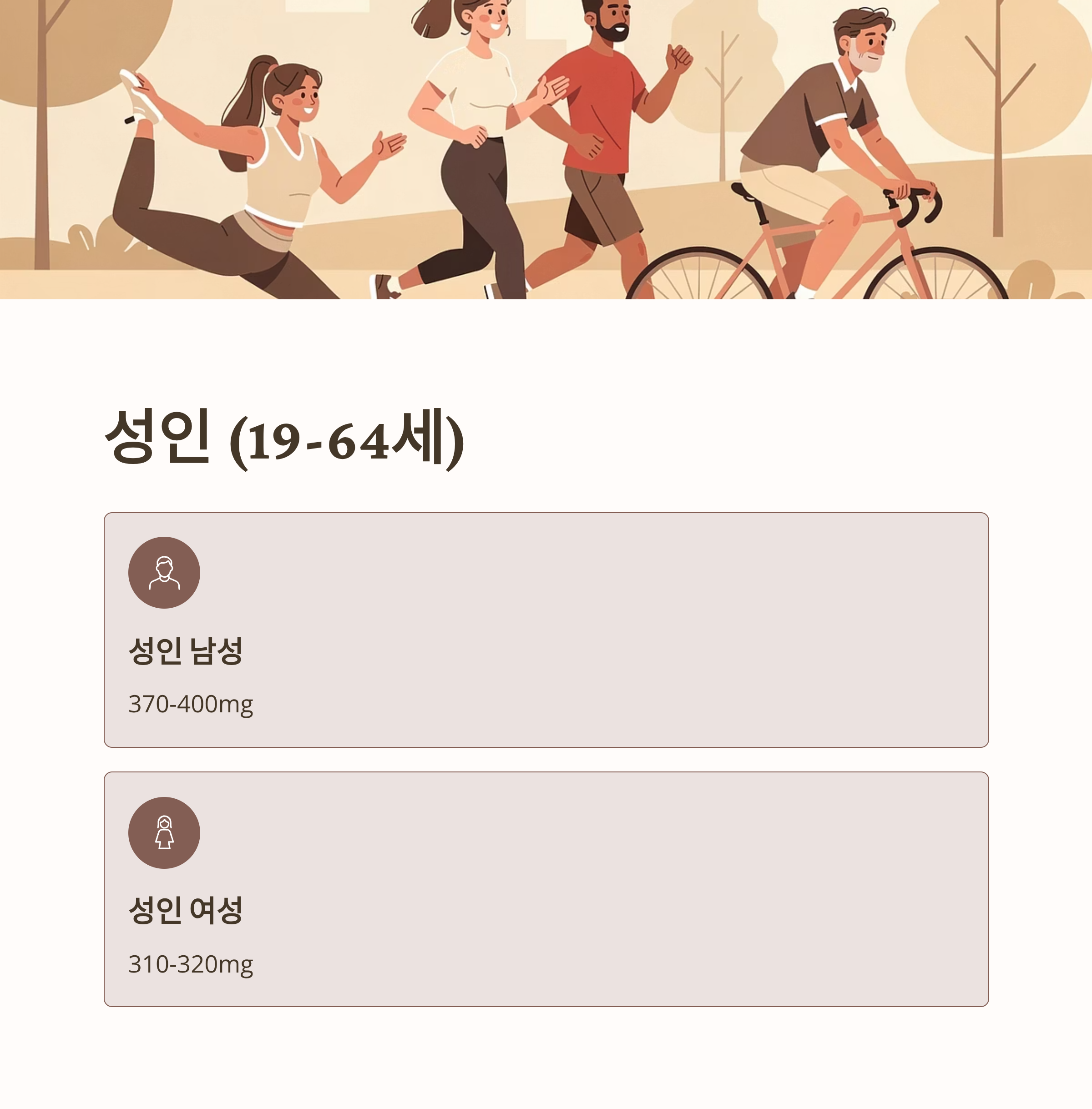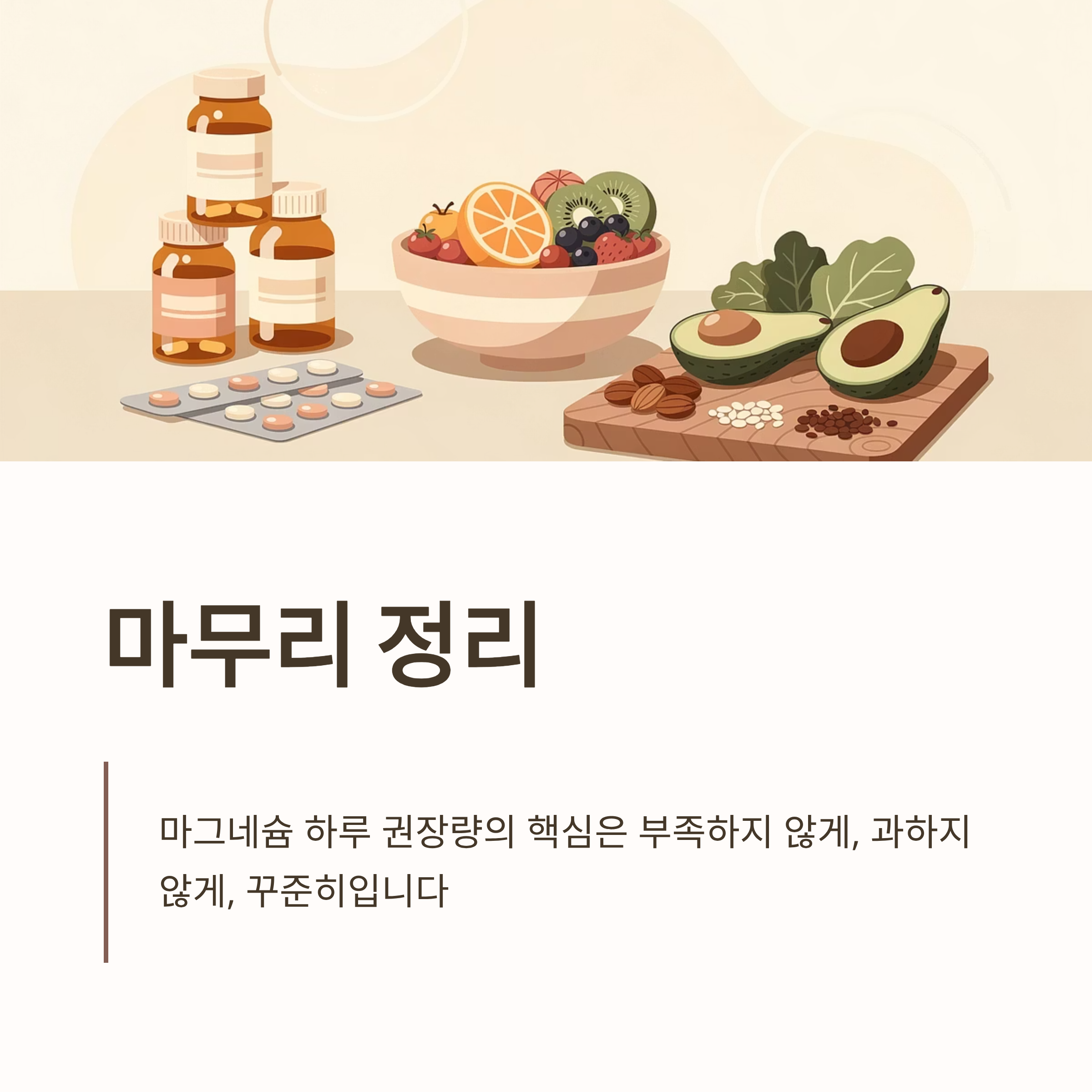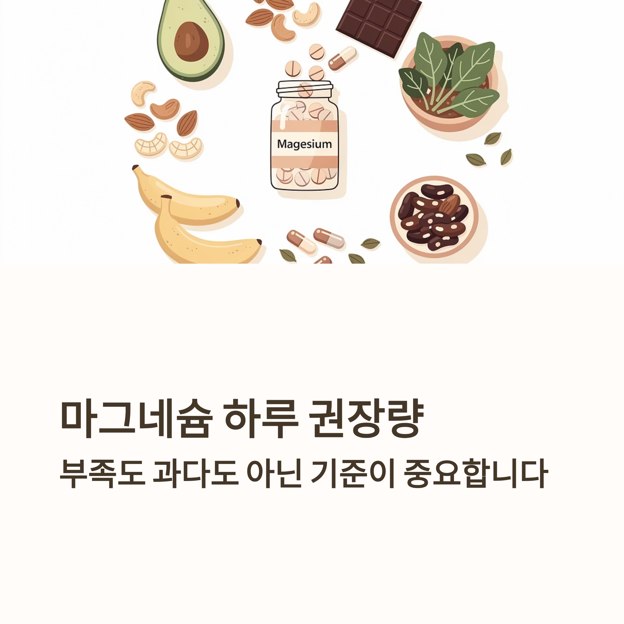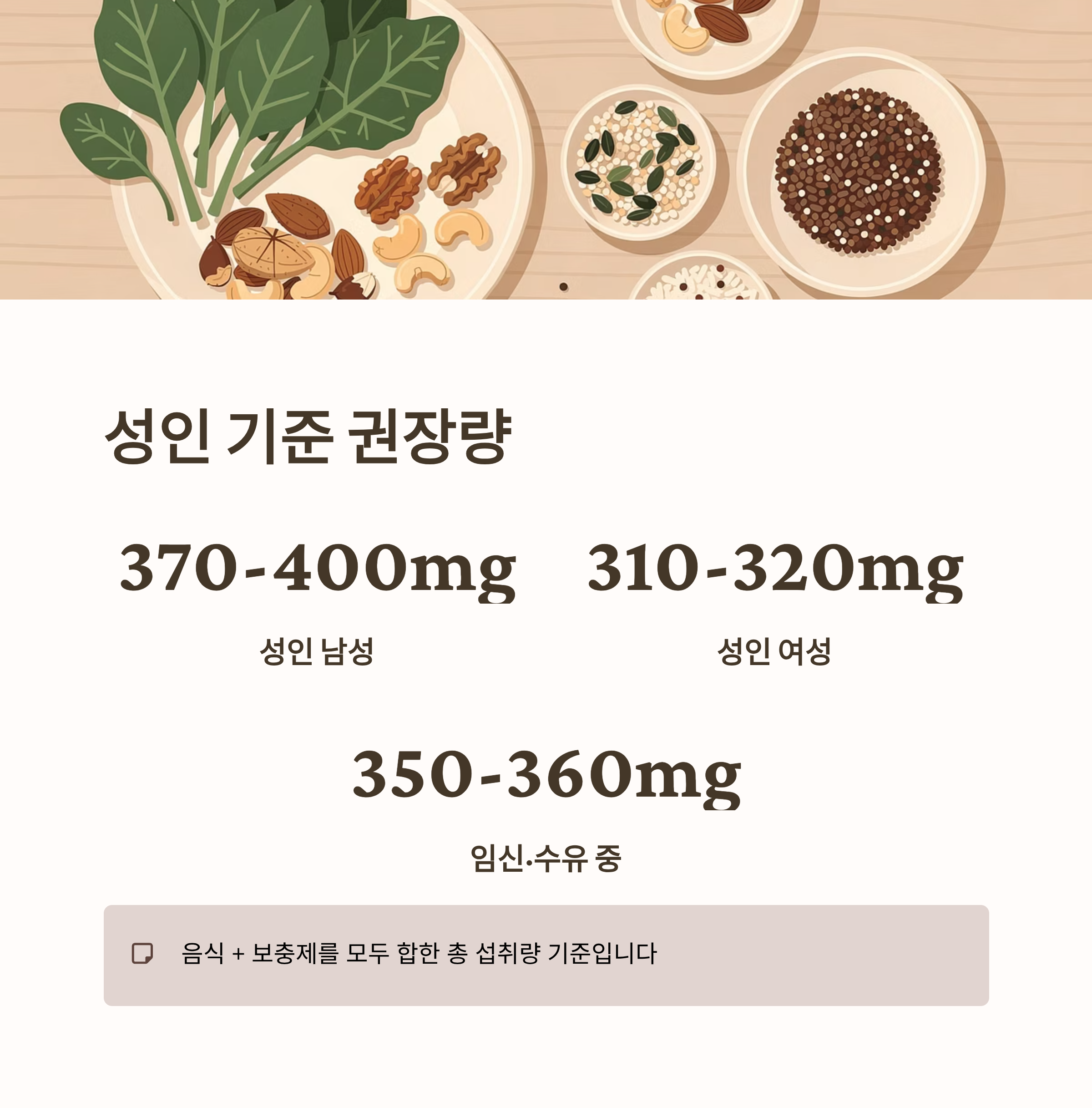 👉 마그네슘 하루 권장량은 성별·연령·생활 습관에 따라 달라집니다.