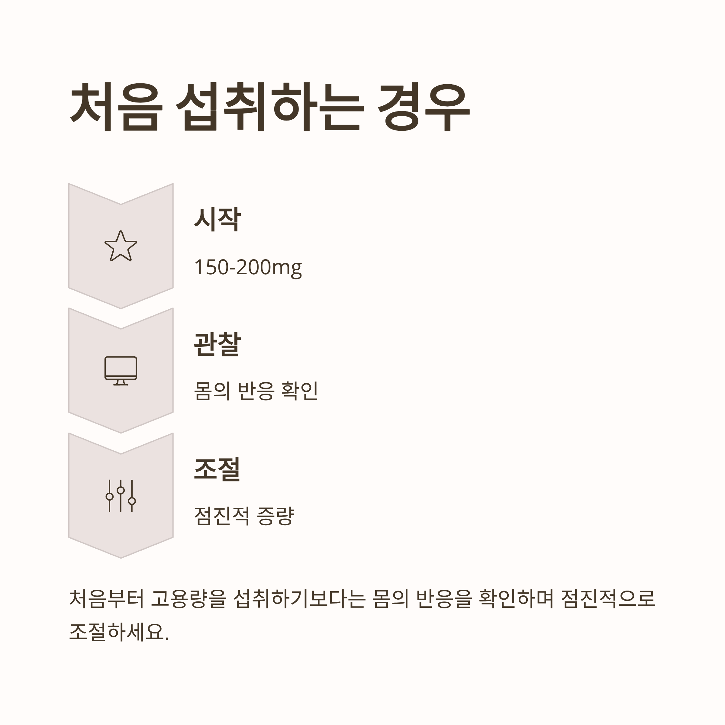 - 처음 섭취하는 경우: 150~200mg부터 시작