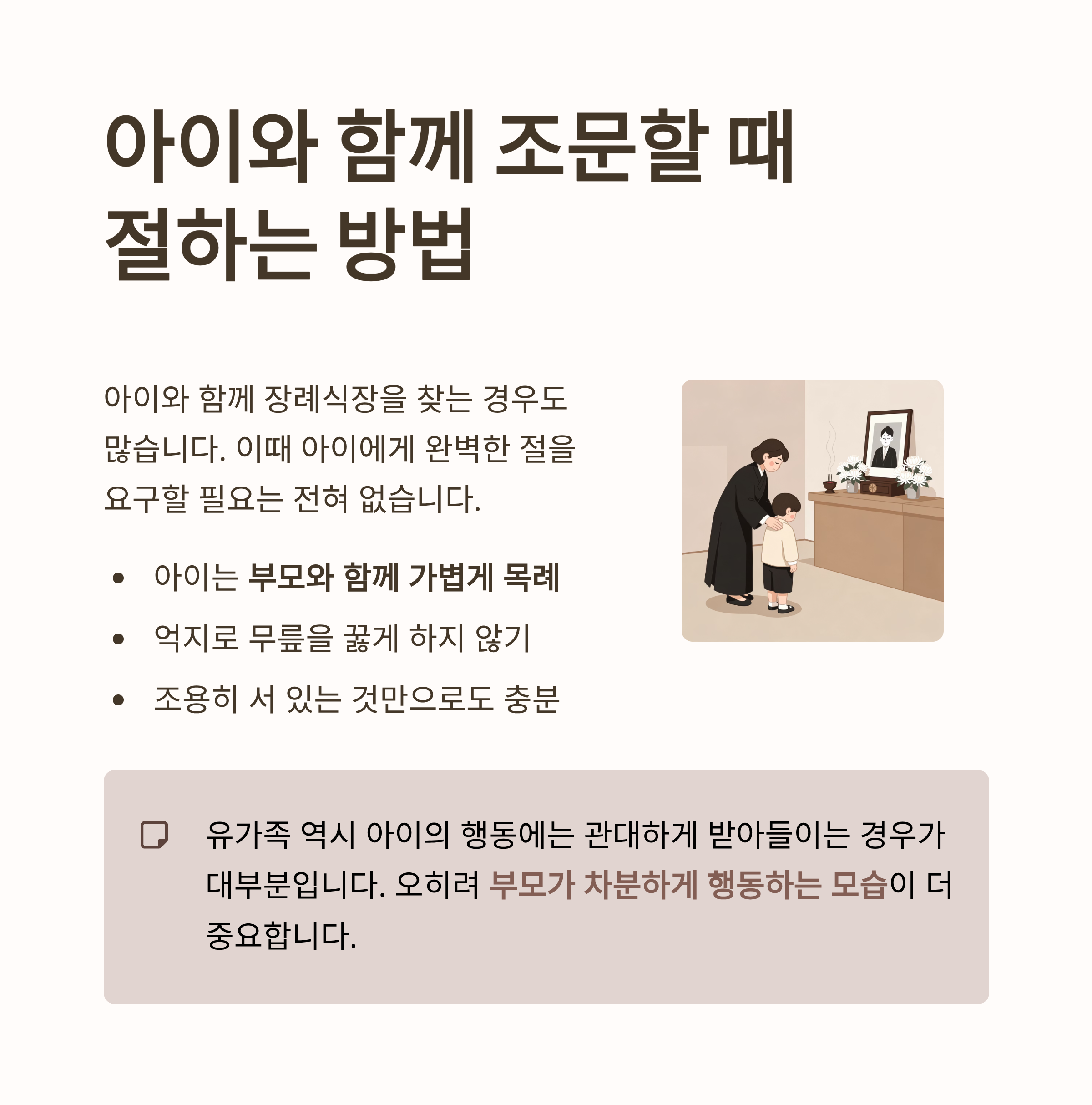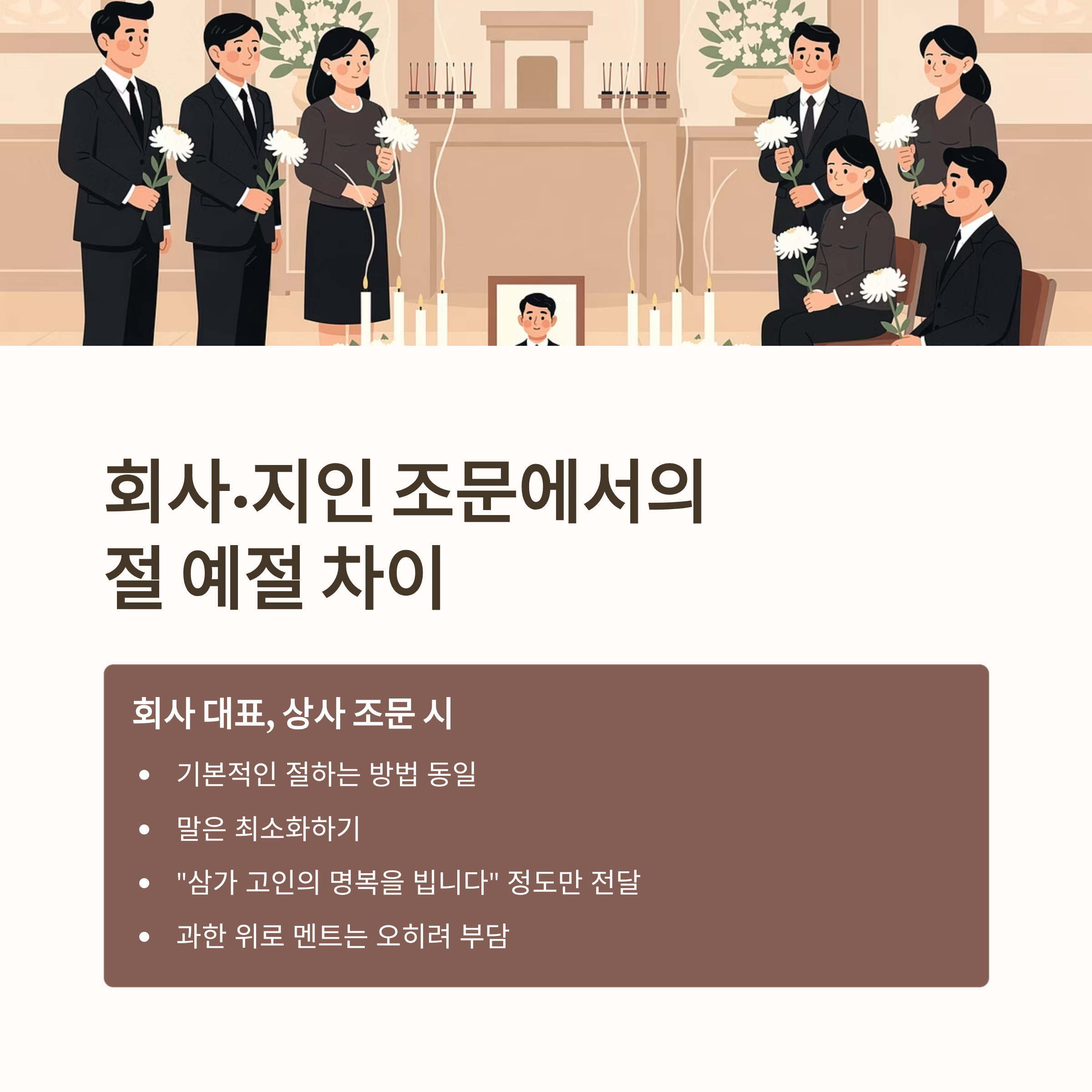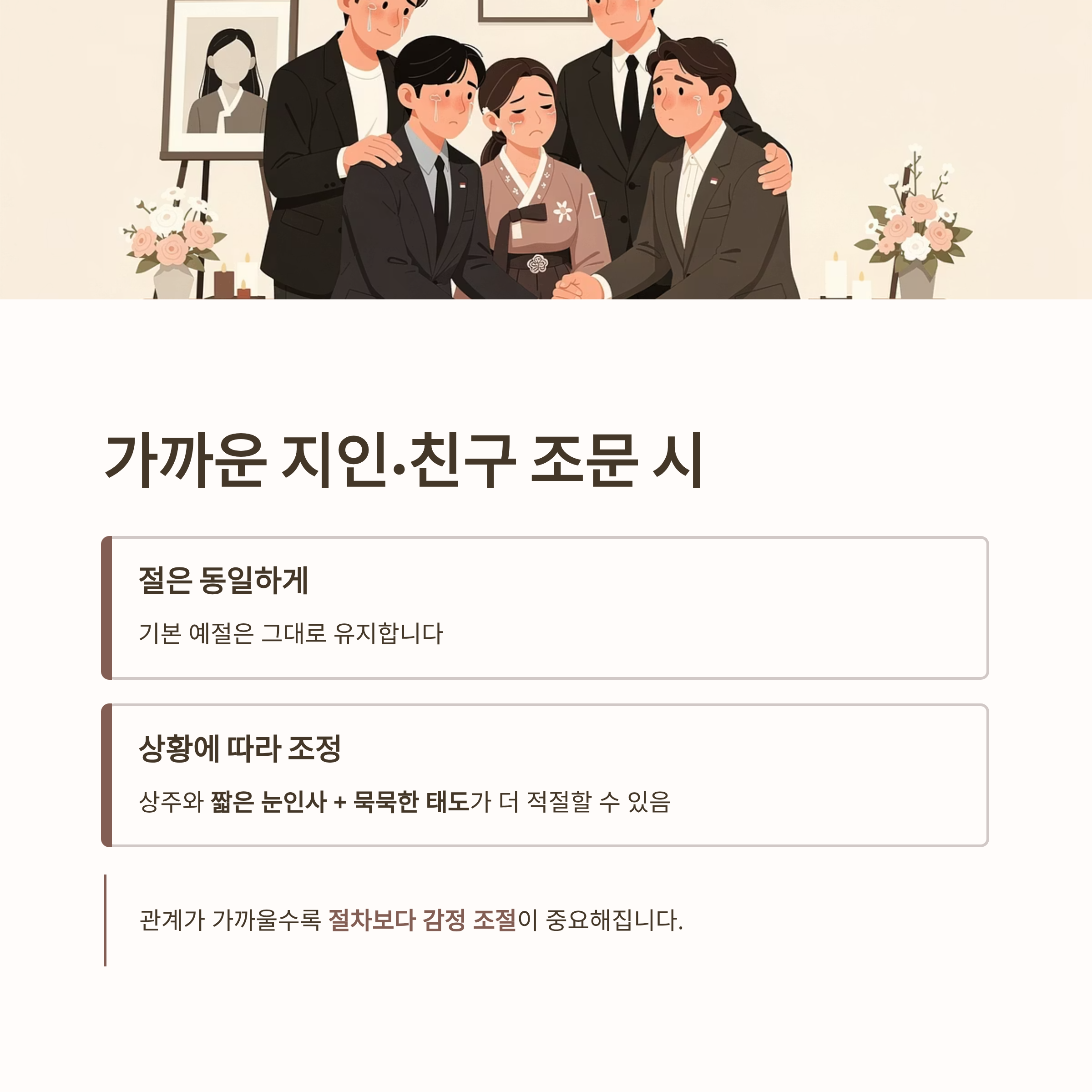 - 상황에 따라 상주와 짧은 눈인사 + 묵묵한 태도가 더 적절할 수 있음